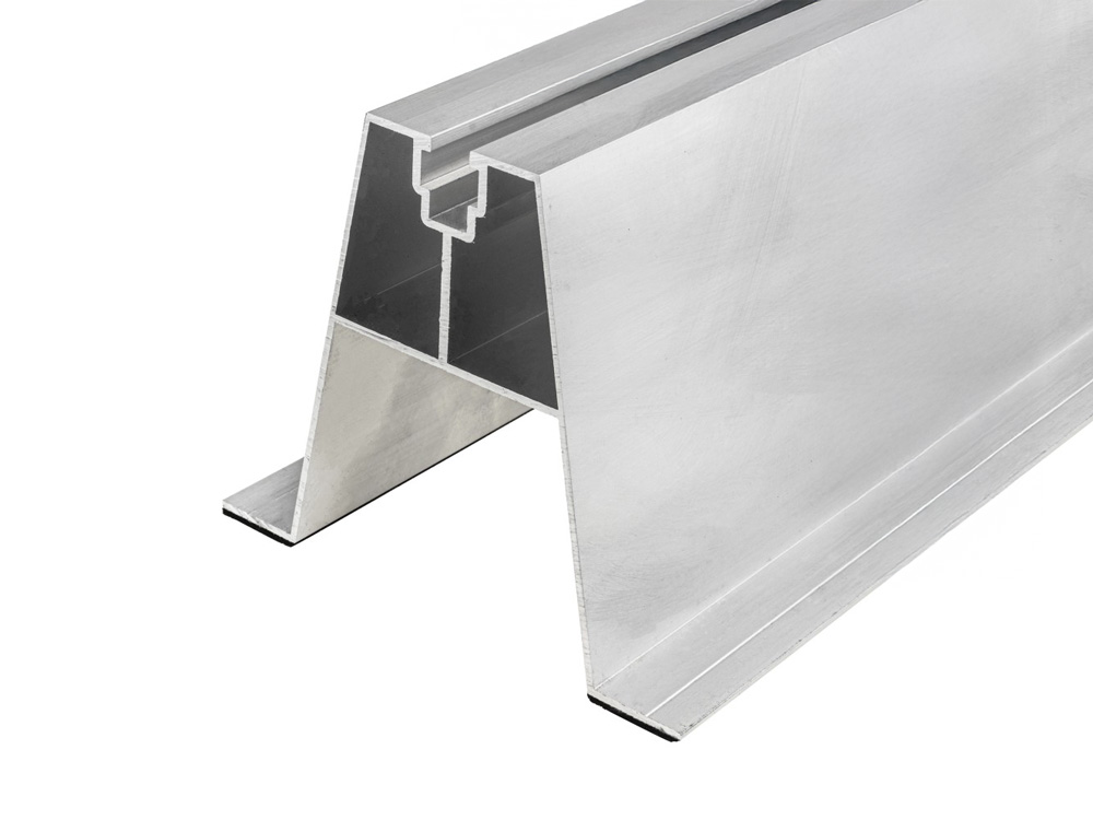 Mostek trapezowy z taśmą EPDM o wysokości 100 mm i długości około 330 mm, przeznaczony do montażu instalacji fotowoltaicznych na dachach pokrytych blachą trapezową. Wykonany z aluminium, kompatybilny z wpustami z kulką oraz nakrętkami kwadratowymi.
