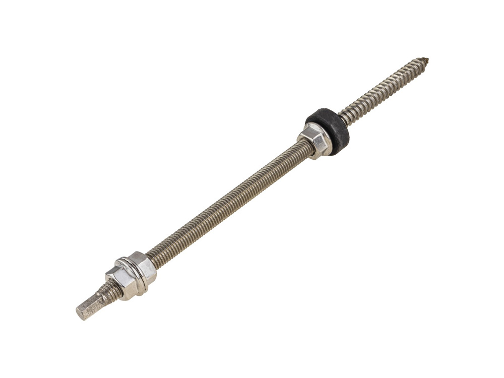 Komplettes Set aus M10x200-Doppelgewindeschraube zur Montage von Photovoltaikanlagen auf Metalldachziegeln. Das Set beinhaltet: Doppelgewindeschraube, drei Flanschmuttern und eine EPDM-Dichtung.