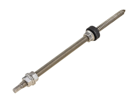 Komplettes Set aus M10x300-Doppelgewindeschraube zur Montage von Photovoltaikanlagen auf Metalldachziegeln. Das Set beinhaltet: Doppelgewindeschraube, drei Flanschmuttern und eine EPDM-Dichtung.